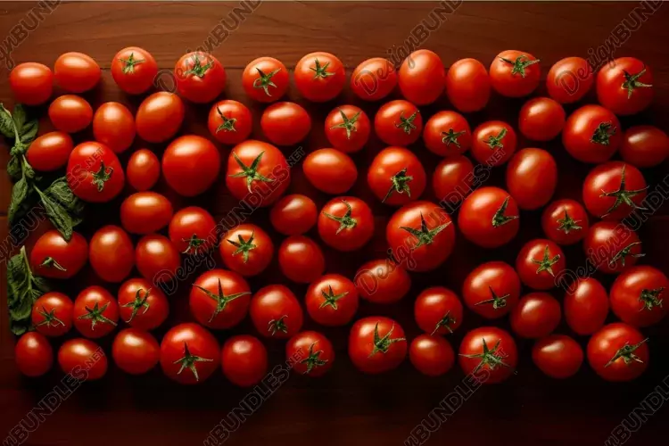 Top-down view of ripe red tomatoes neatly arranged on a rich wooden background