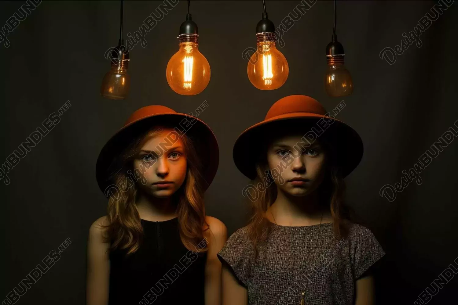 Vintage Dark Background Portrait Girls Lighting Illuminated Mysterious Hats Bulbs