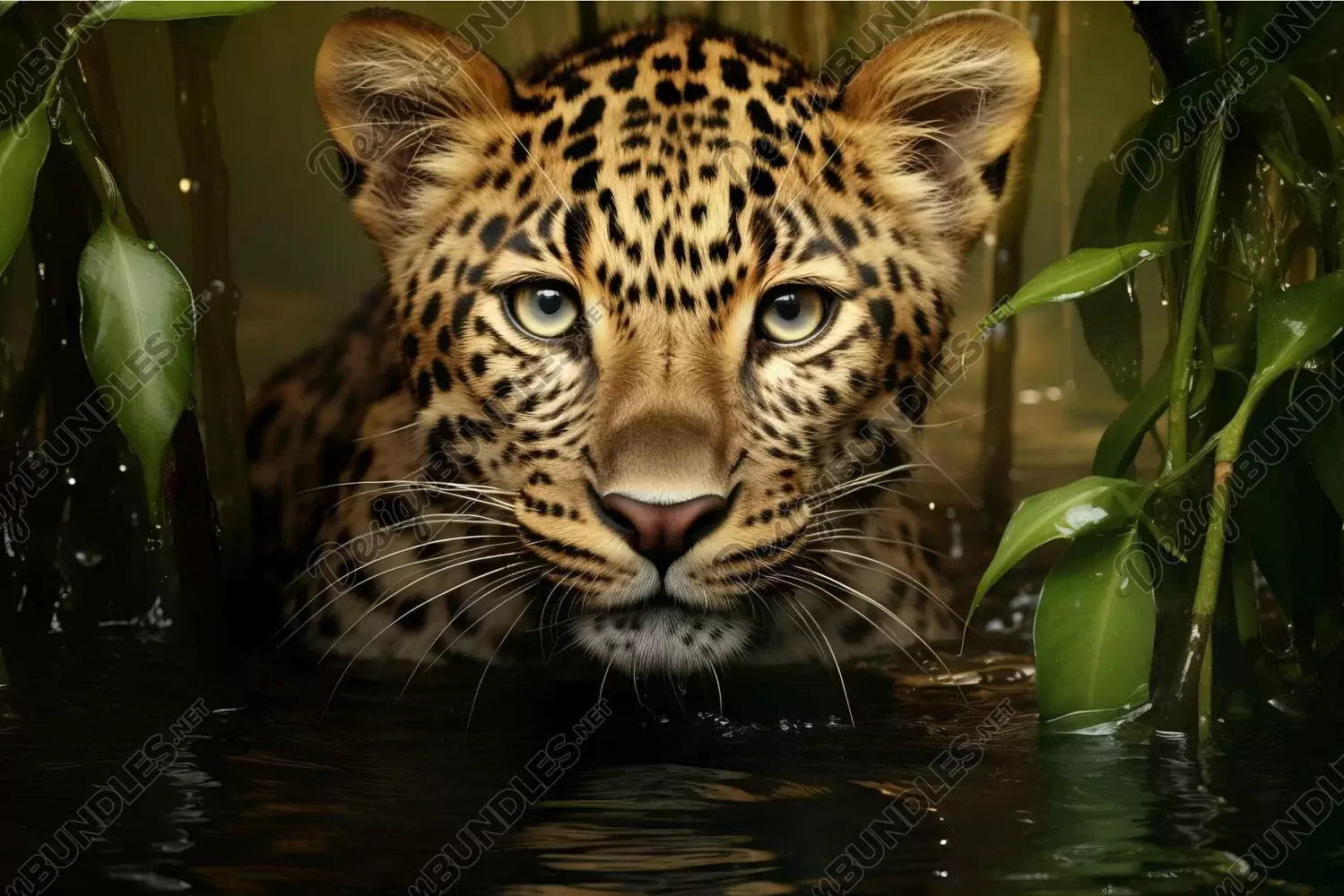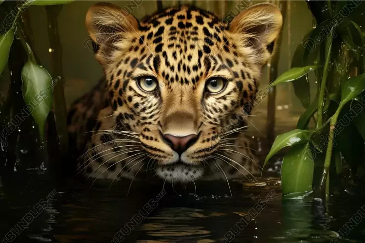 Close-up of a leopard's face with piercing eyes amidst water and green foliage