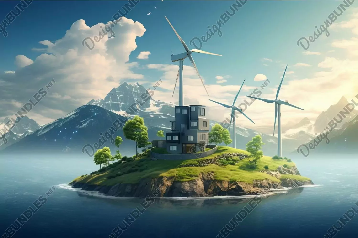 Eco-friendly house on a small island with wind turbines against a scenic mountain backdrop