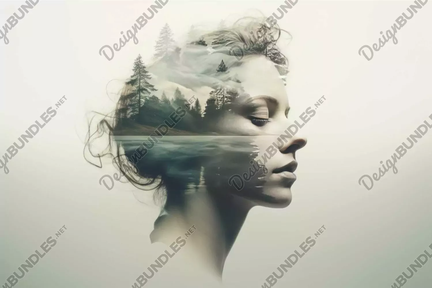 Artistic blend of a woman's profile with serene forest landscape