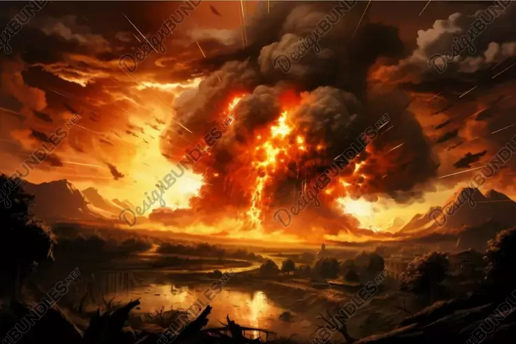 Dramatic artwork of a catastrophic volcanic explosion under an ominous red sky
