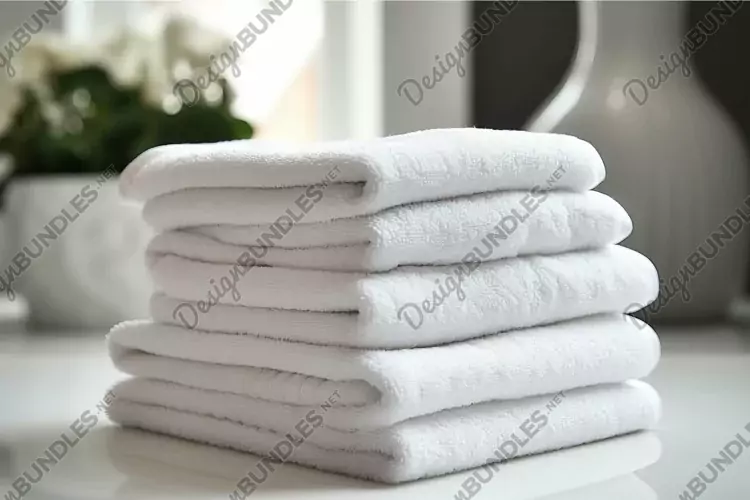 Neatly folded clean white towels on a table with soft natural background