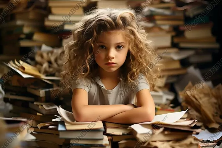 Thoughtful child amidst piles of books example image 1