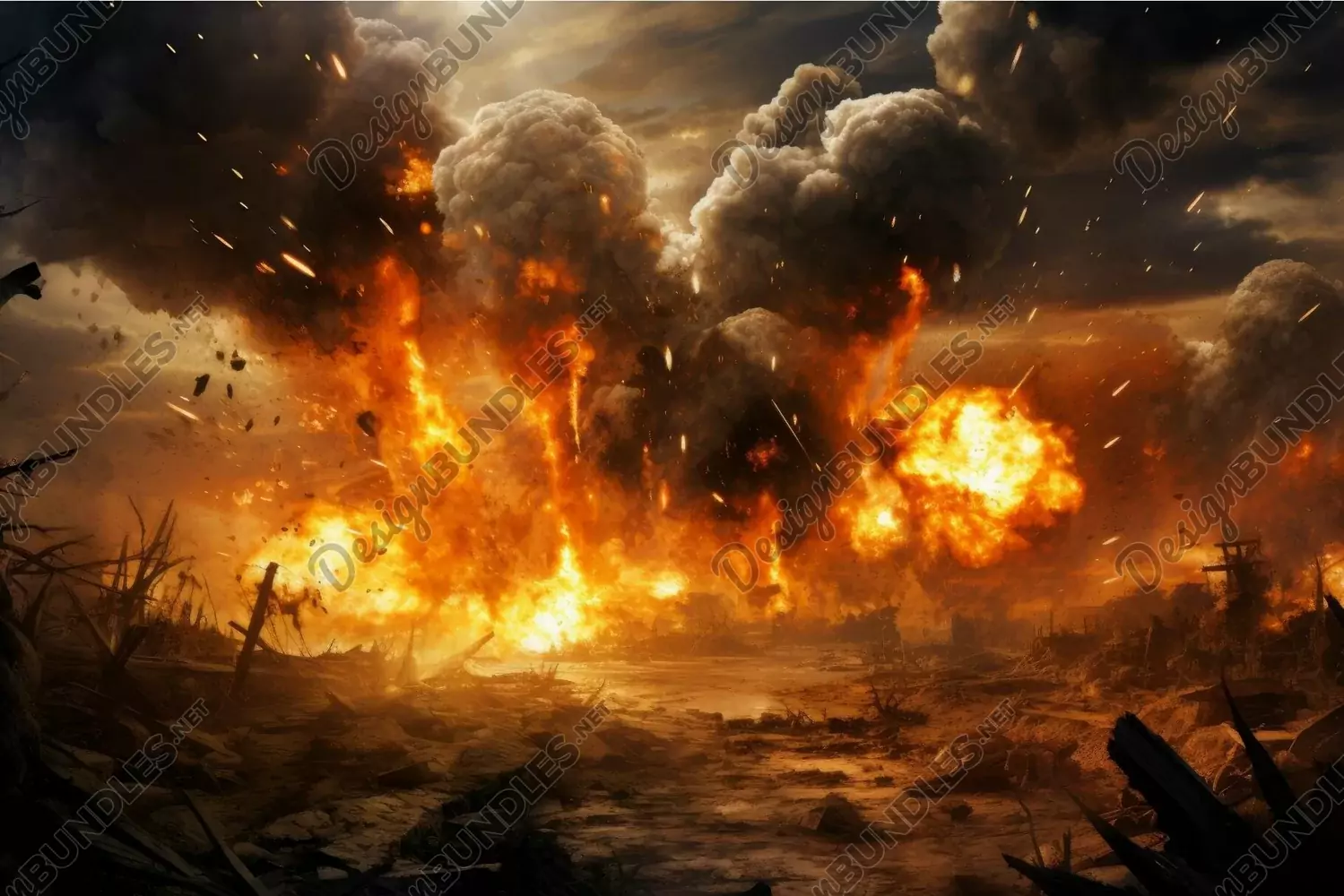 Dramatic scene of a fiery explosion engulfing a devastated landscape at dusk