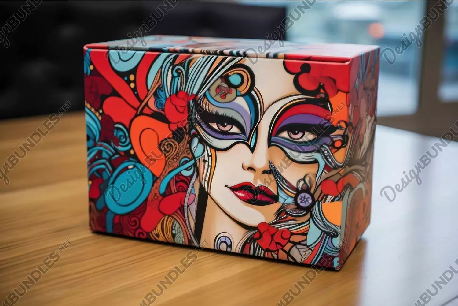 Vibrant box with a detailed, artistic face design placed on a wooden surface