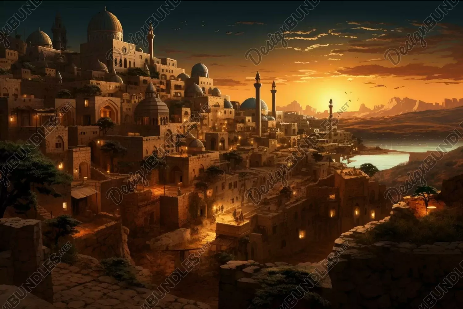 Majestic sunset over an ancient fantasy city
