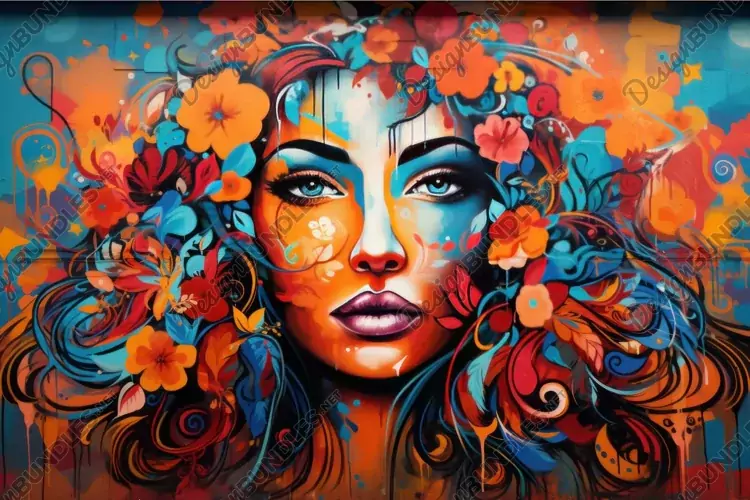 Vibrant street art of a woman with floral motifs example image 1