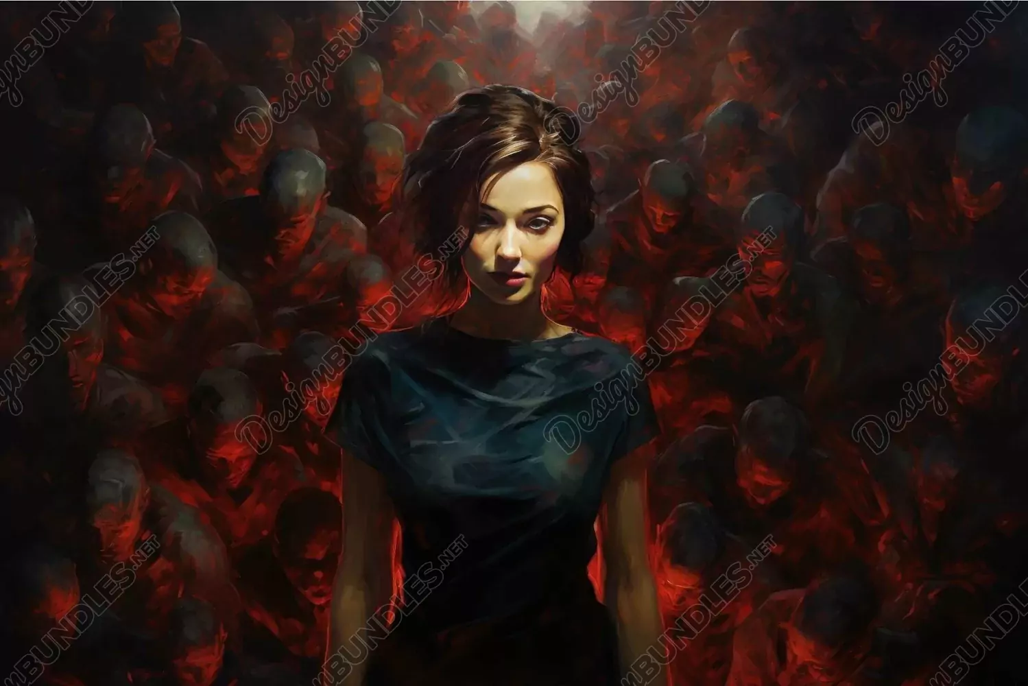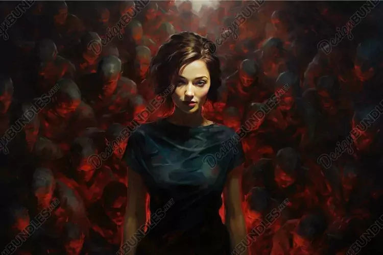 Haunting digital art piece featuring a woman surrounded by eerie, faceless figures