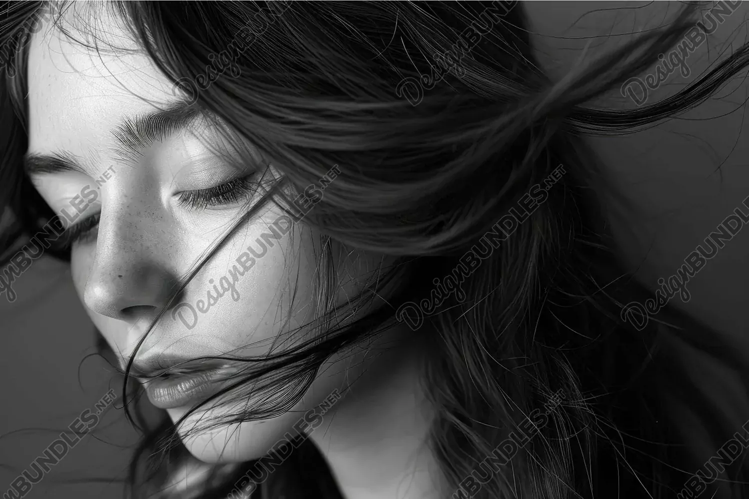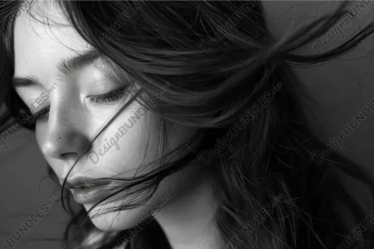 Close-up of a serene woman with windswept hair in black and example image 1