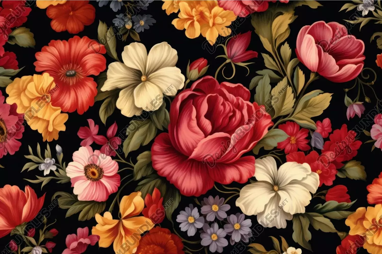 Beautiful array of colorful flowers arranged in a seamless pattern against a dark backdrop