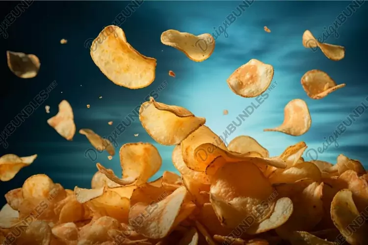 Dynamic image capturing potato chips frozen in motion against a vibrant blue backdrop