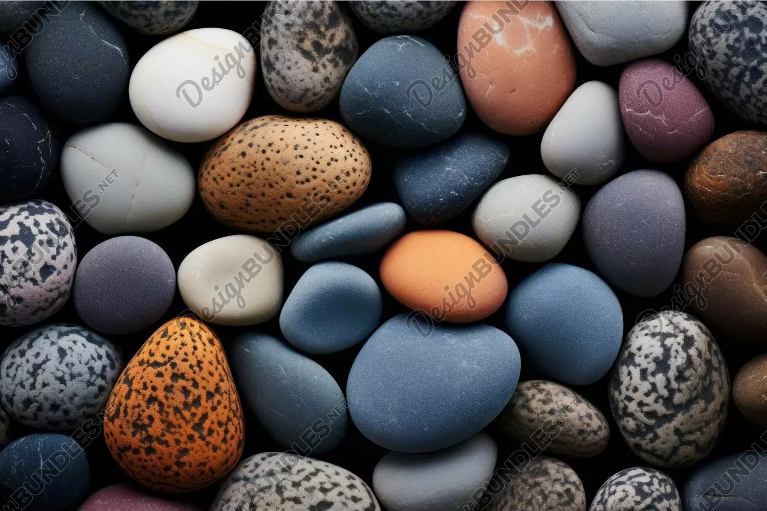Top view of a diverse array of smooth stones and pebbles with various colors and patterns