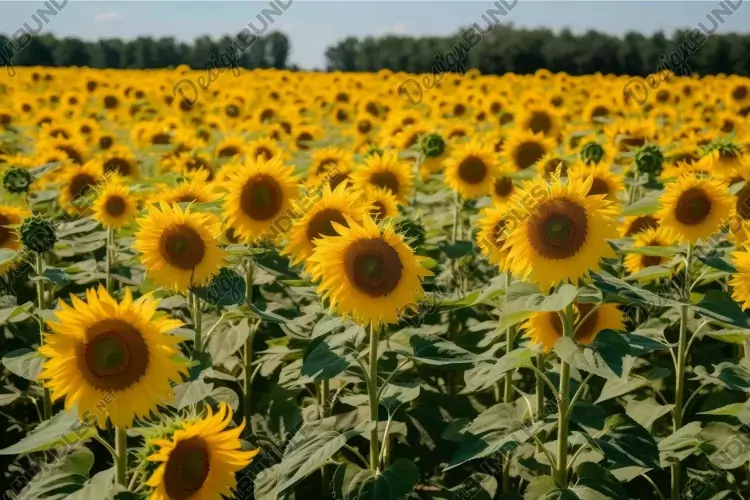 Lush sunflower field with vibrant yellow blooms against a clear blue sky