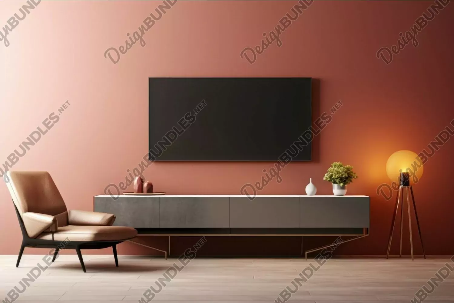 Elegant minimalist living room with wall-mounted tv and stylish furnishings against a warm colored wall