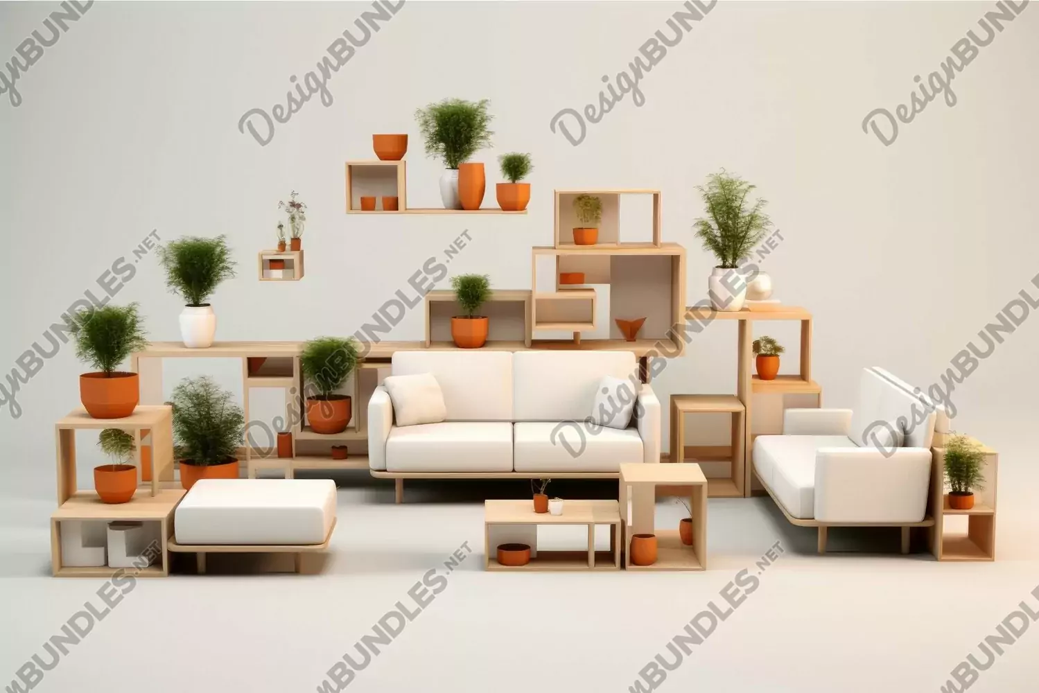 Similar Design Products to Modern living room interior with geometric shelving and plan