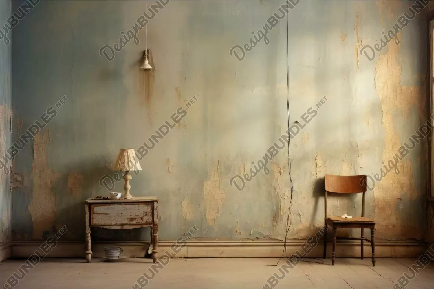 Rustic and serene interior scene featuring an old desk with a lamp, a chair, and a wall with peeling paint