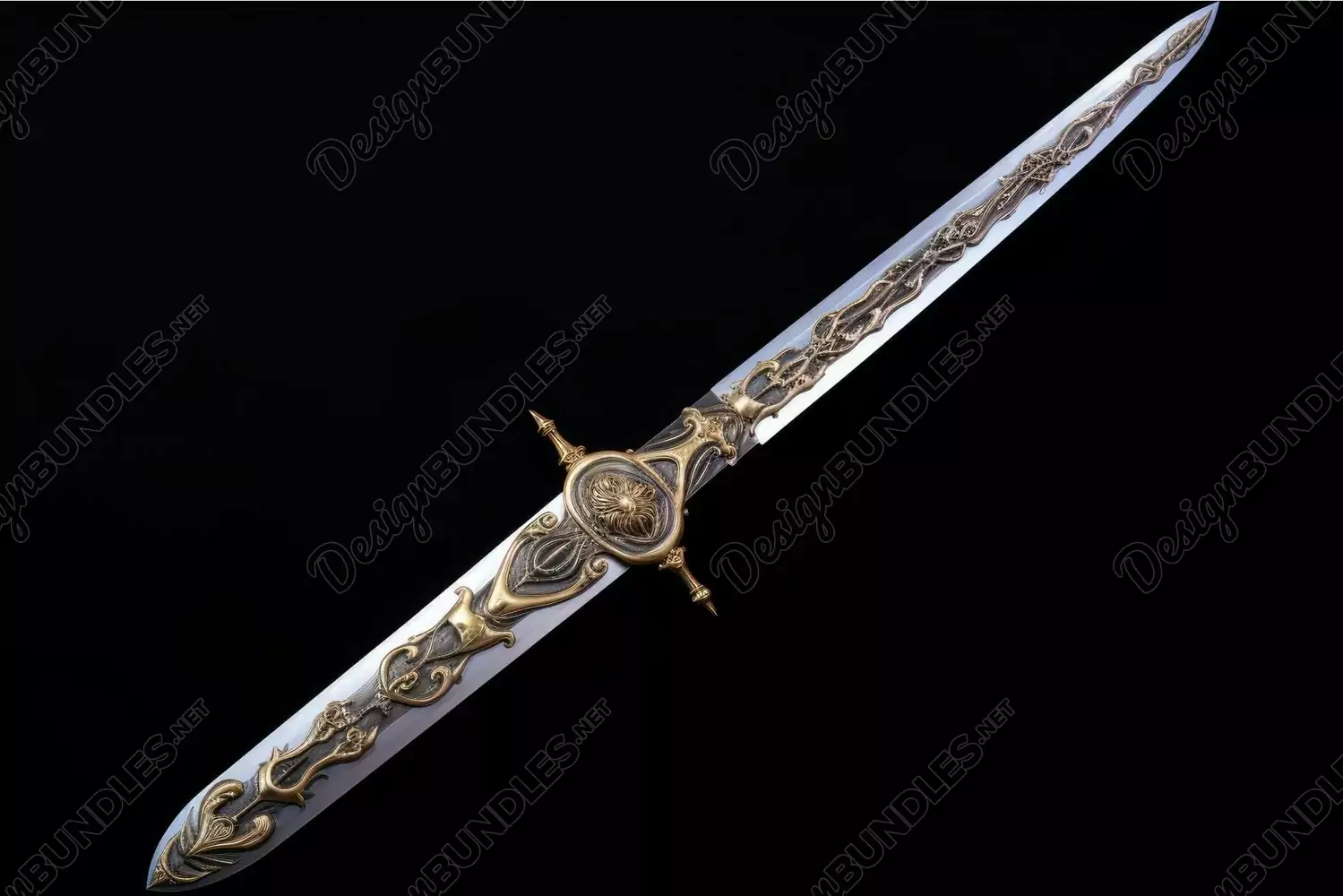 Elegant vintage sword with intricate embellishments, isolated on a dark backdrop