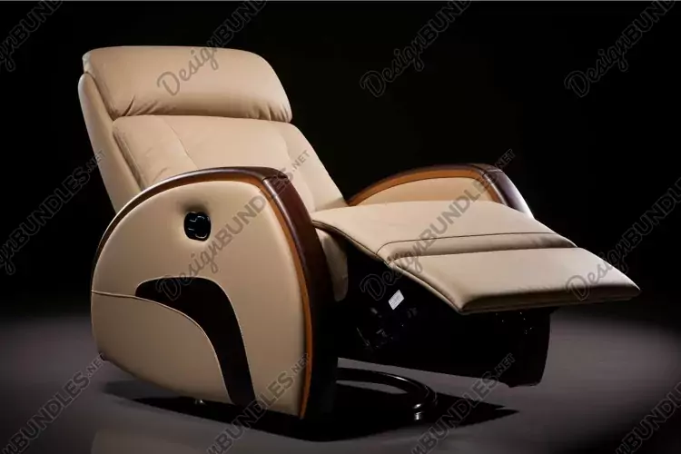Elegant beige reclining chair with wooden accents showcased on a dark backdrop