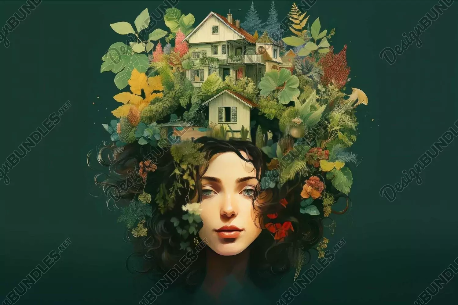 Artistic portrait of a woman with a vibrant house and flora in her hair, symbolizing harmony with nature