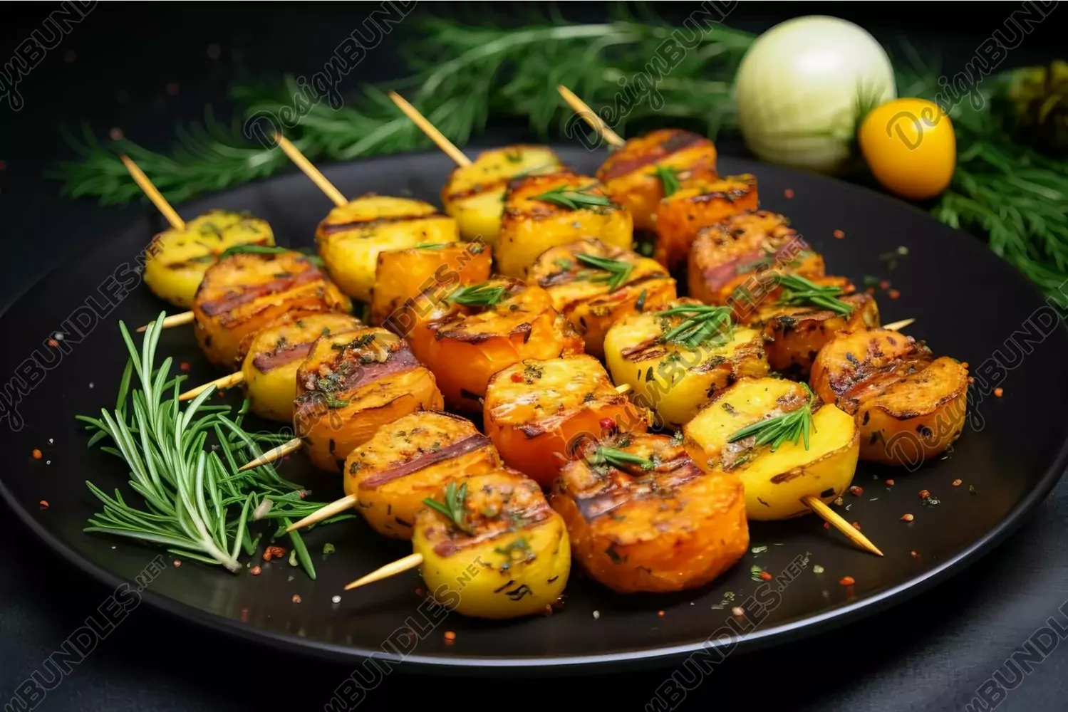Black Rosemary Grilled Vegetarian Herbs Plate Barbecue Potatoes Seasoned Skewers