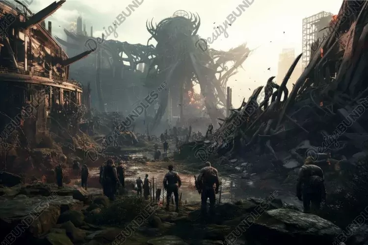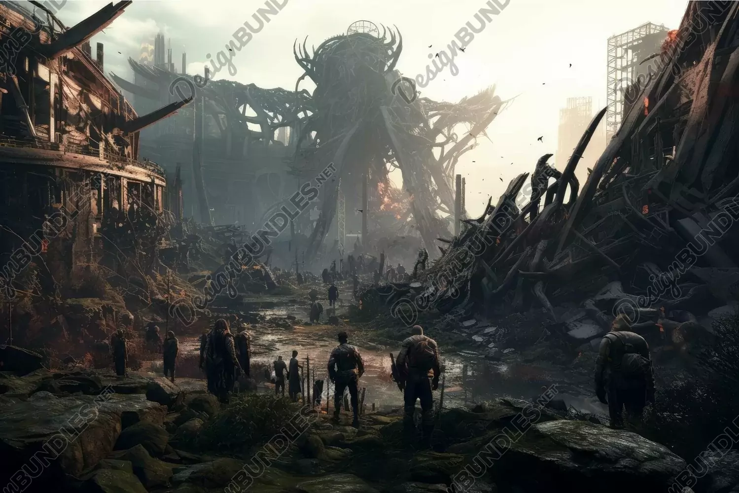 Similar Design Products to Group of survivors walk through the ruins of a desolate city