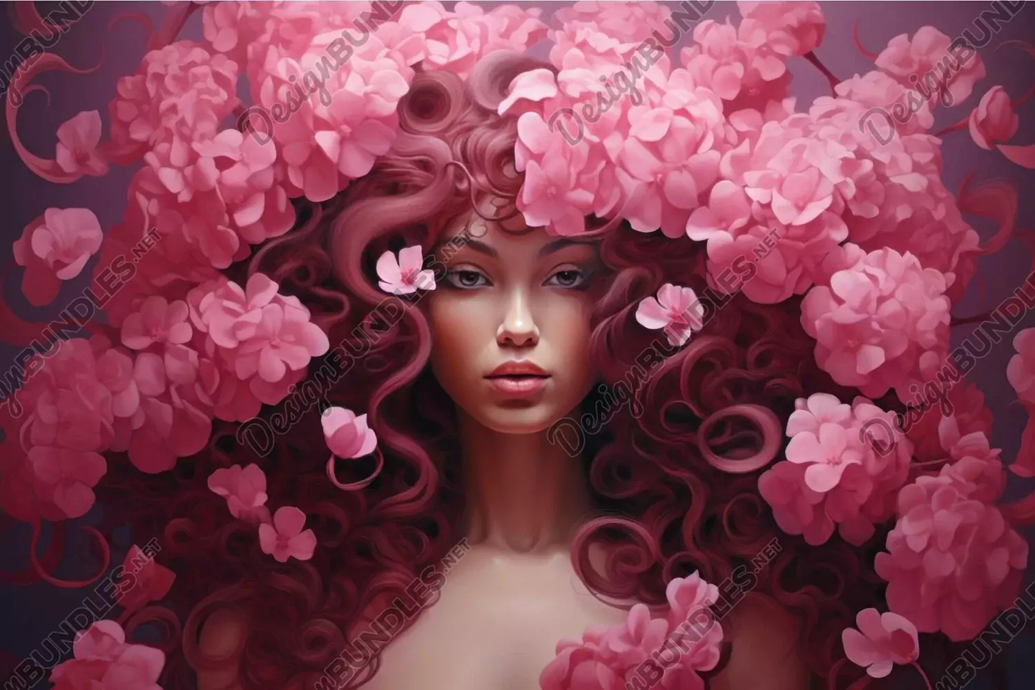 Surreal digital artwork of a woman with cascading hair and an array of beautiful pink roses