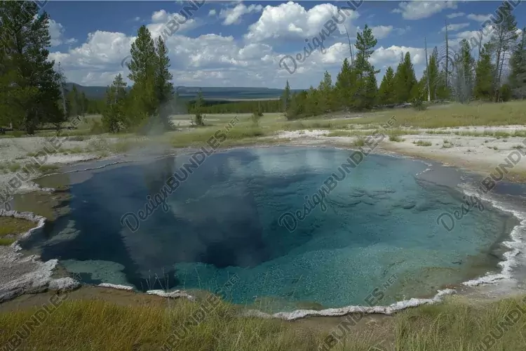 Stunning view of a tranquil geothermal spring with vibrant blue water surrounded by a lush forest