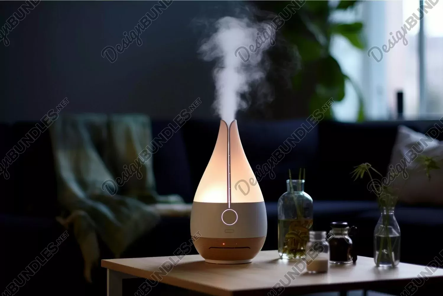 Aroma diffuser emitting steam on a cozy evening