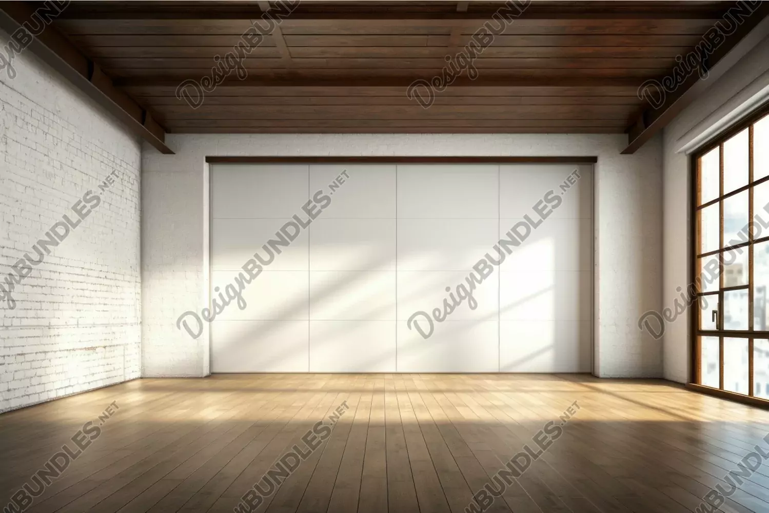Sunlit empty loft space with white wall and wooden floors example image 1