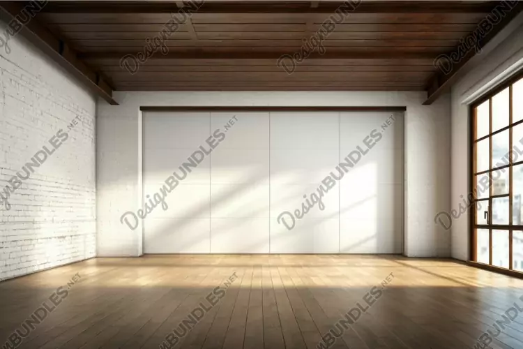 Bright and spacious loft with sunlight casting shadows on a blank wall, ideal for mockups