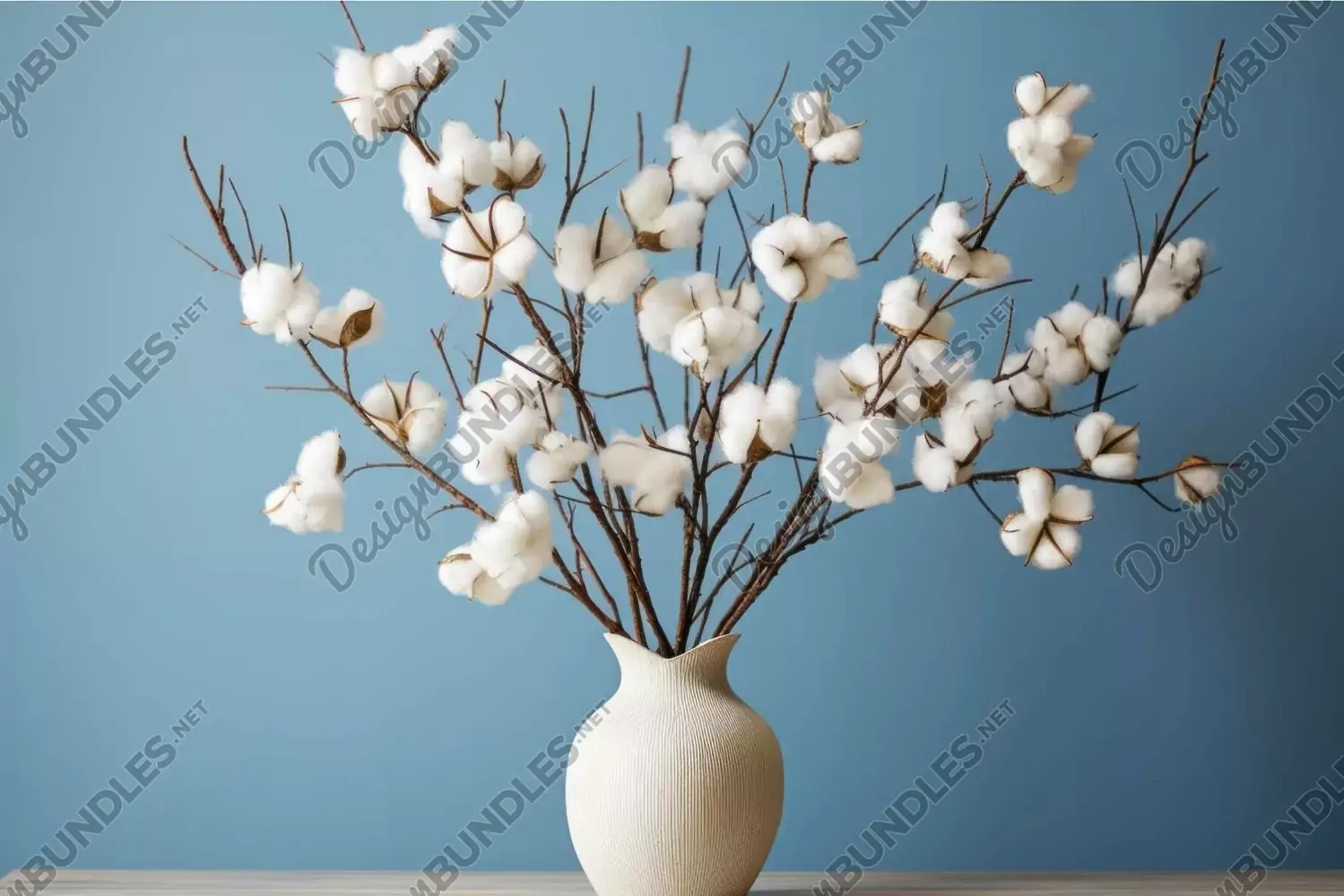 Minimalist style image featuring a white vase with fluffy cotton branches on a serene blue backdrop