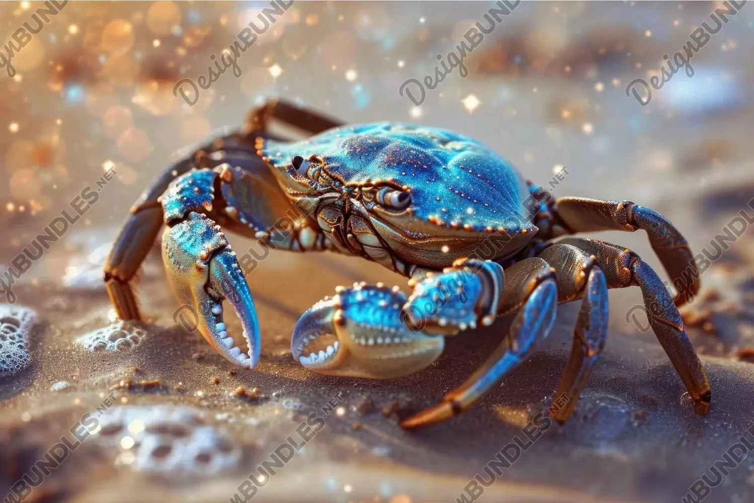 A digital artwork of a crab with a cosmic design against a bokeh background