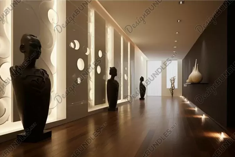 Sleek gallery corridor with artistic sculptures and warm ambient lighting
