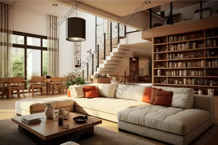 Elegant interior design of a spacious living room with comfortable sofa and stylish decor