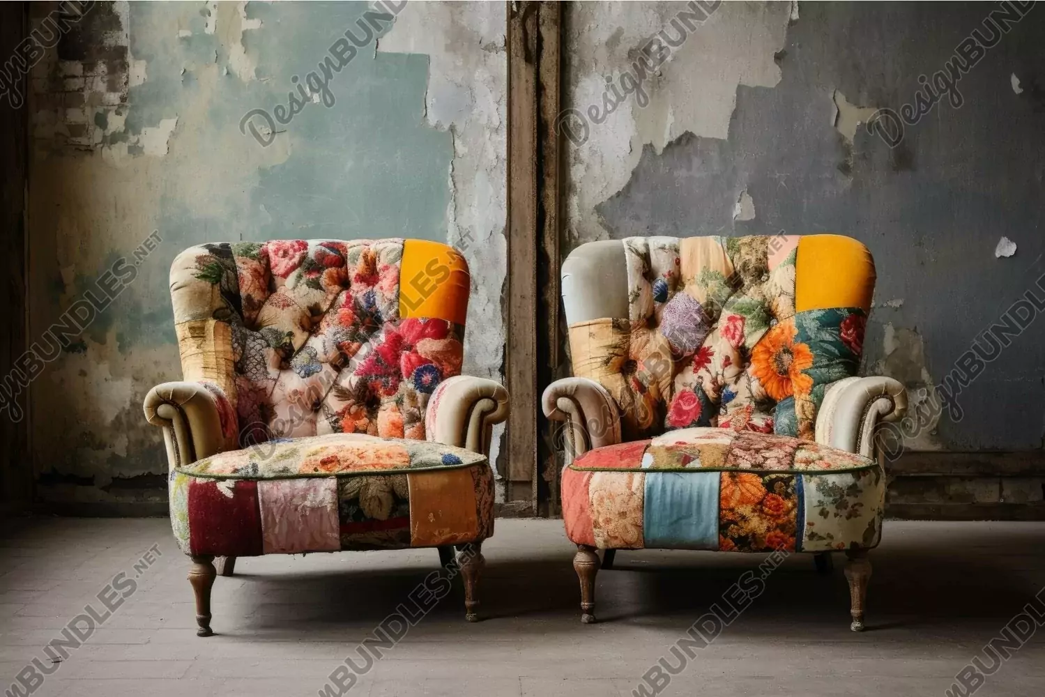 Vintage Rustic Distressed Interior Aged Wall Vibrant Furniture Patchwork Armchairs