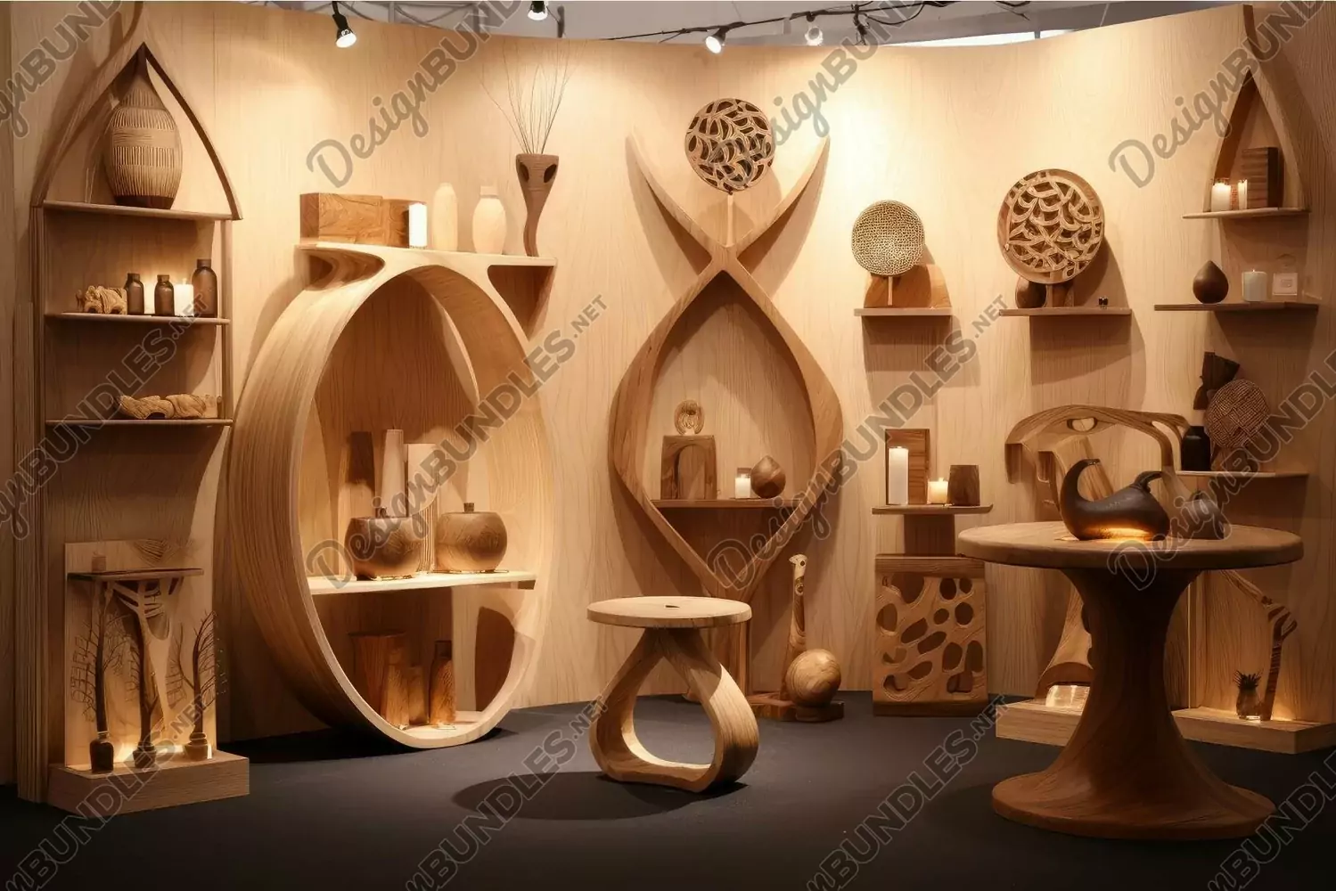 Creative woodwork pieces displayed in a stylish exhibition s example image 1