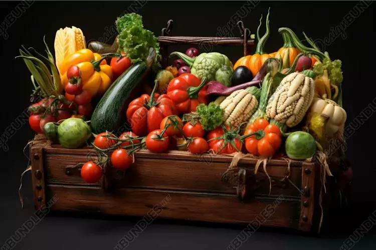 Rustic wooden crate filled with a bountiful assortment of fresh, organic, and colorful vegetables, including corn, tomatoes, zucchini, lettuce, eggplant, and peppers, displayed on a dark background