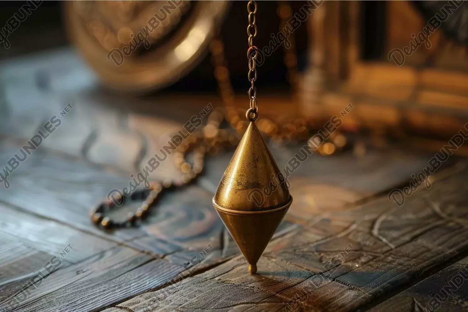 Golden pendulum hanging over wooden table in spiritual atmos example image 1