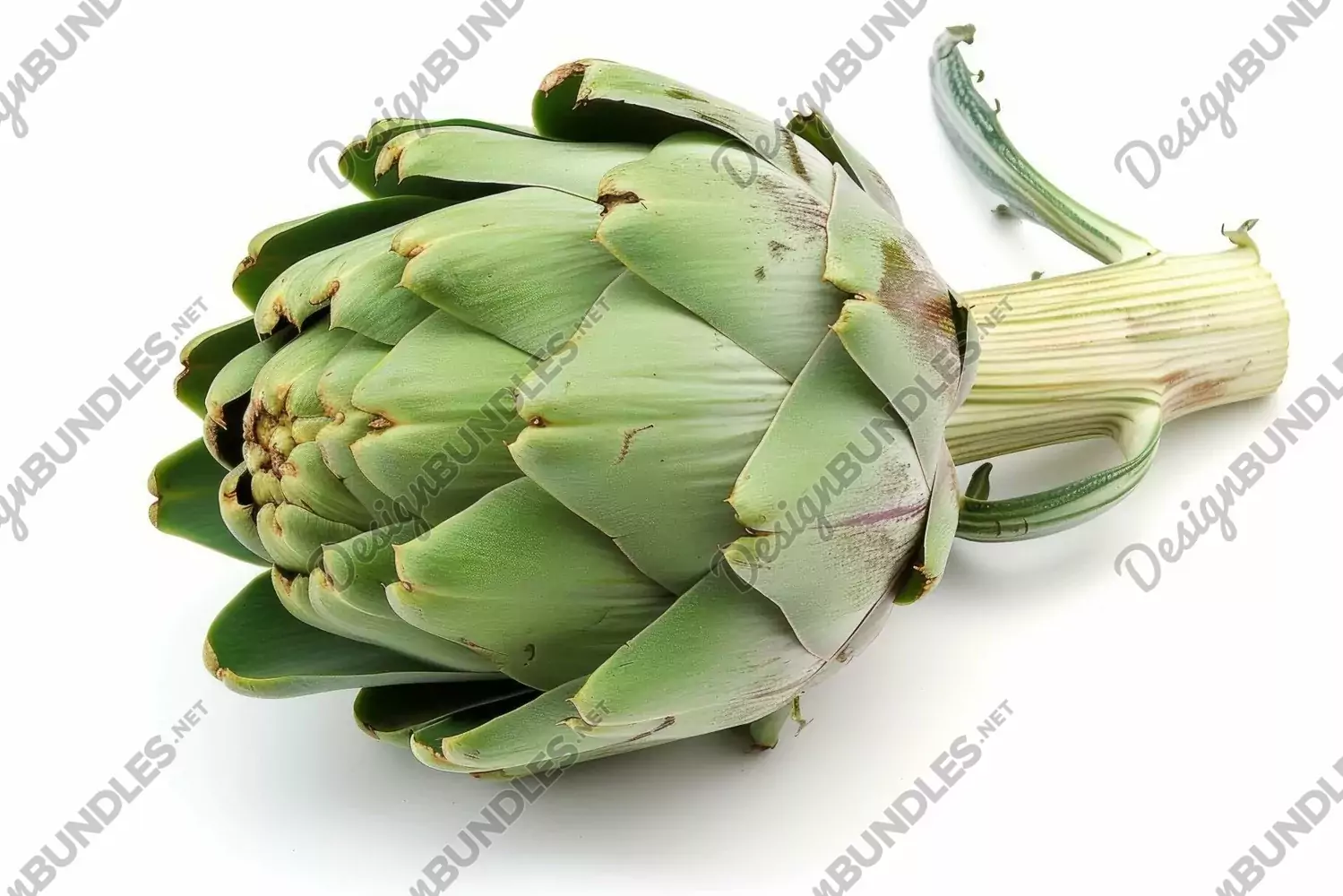 Single artichoke with a thick stem is lying on a pure white background