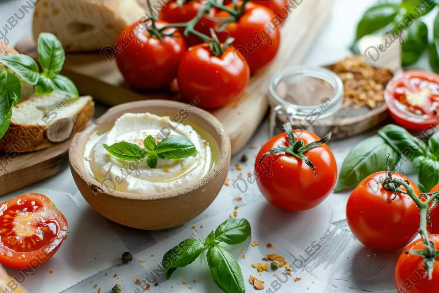 Bowl of labneh with fresh cherry tomatoes and rustic bread is waiting on a table