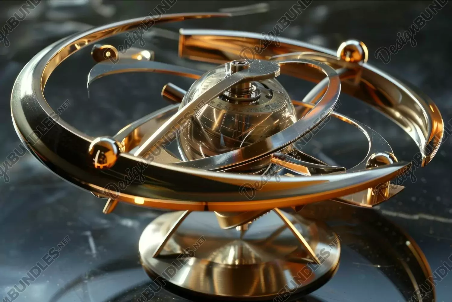 Complex metallic kinetic art sculpture with spheres rotating perpetually on a reflective surface