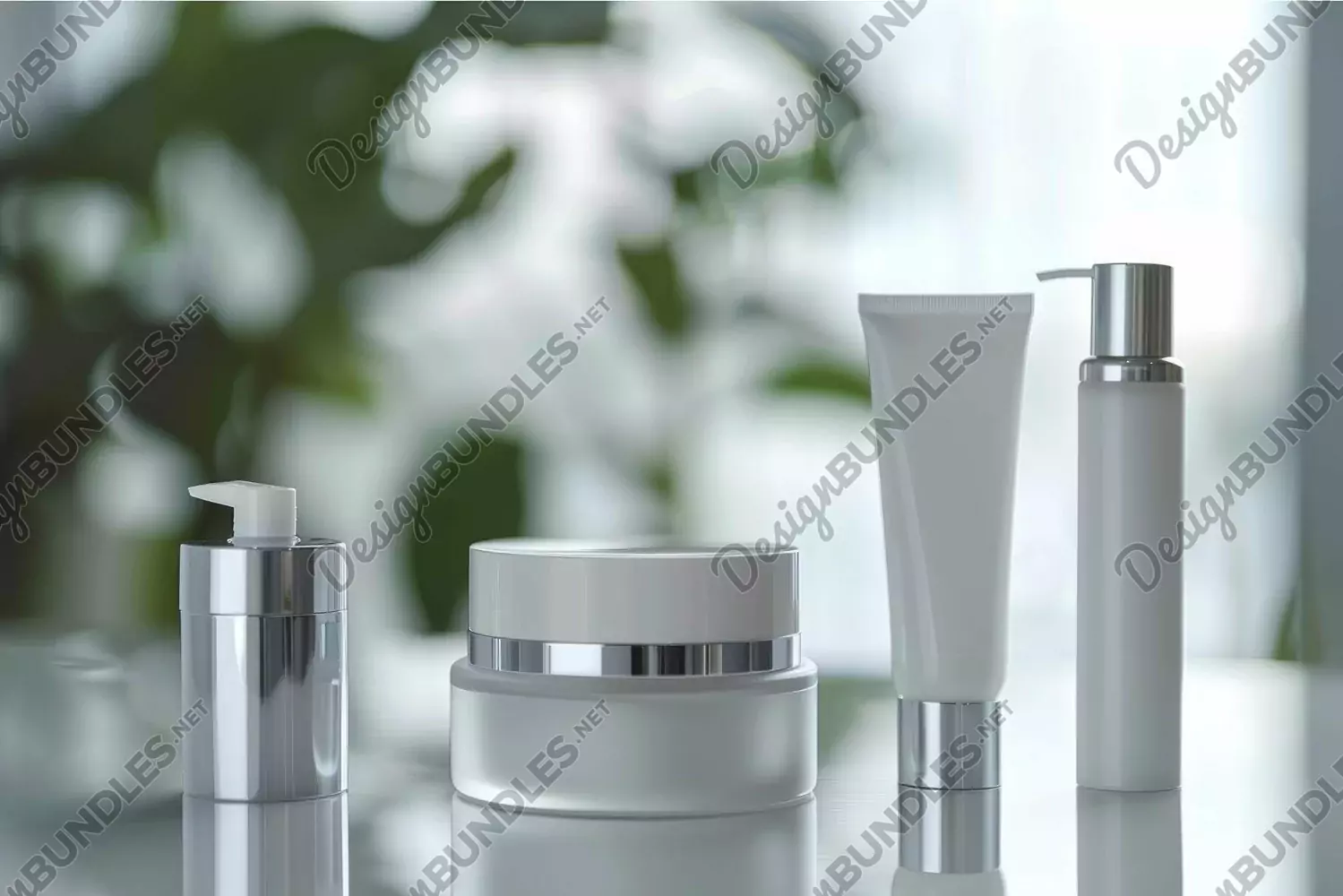 Set of cosmetic bottles with cream or lotion on glass table example image 1