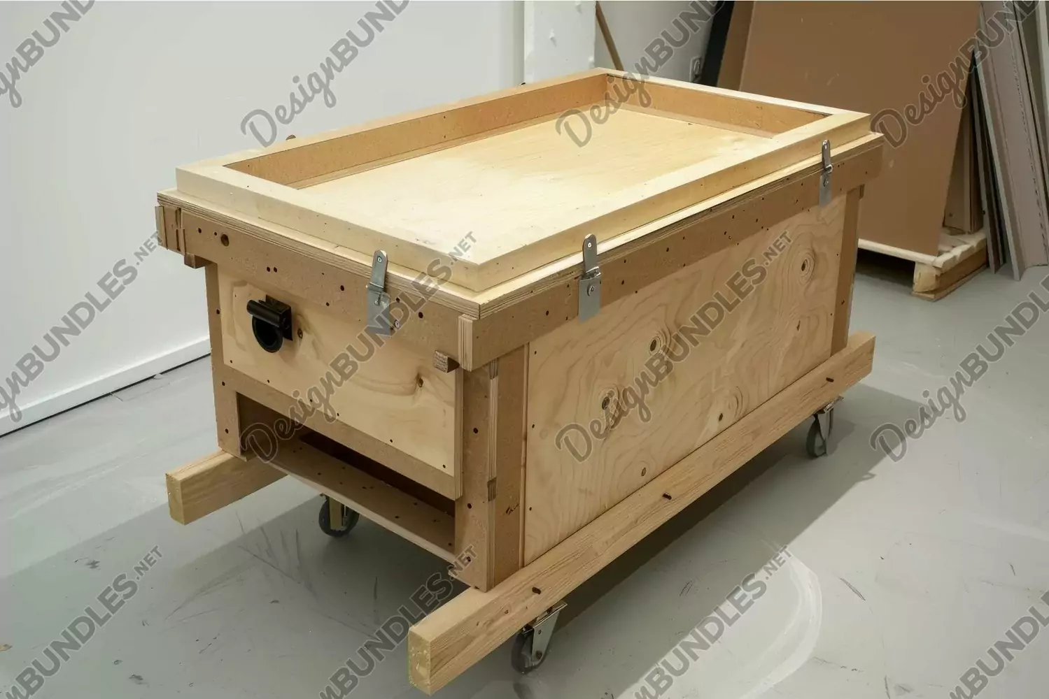 Large wooden crate with wheels is standing on a concrete floor in a workshop, ready for transport or storage