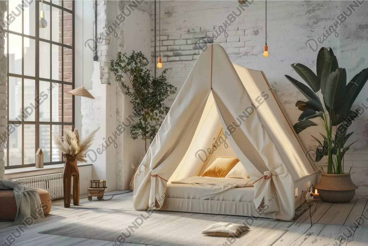 Cozy kids room with a play tent standing in a sunny loft apa example image 1