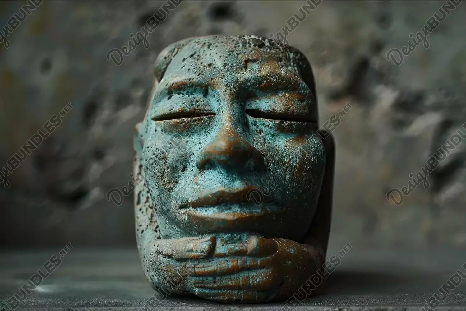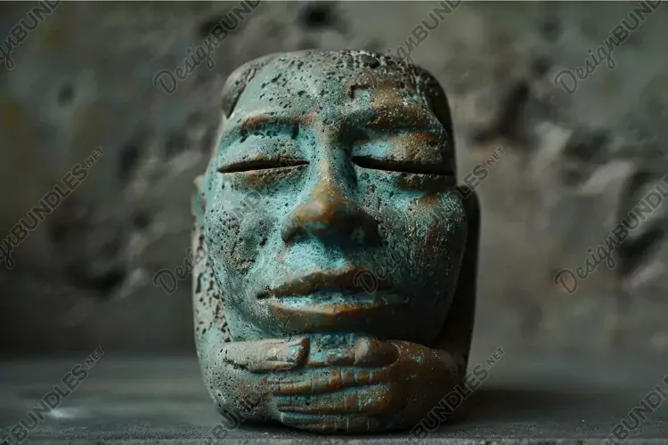 Ancient stone head sculpture with a weathered, teal patina rests its chin on its folded hands