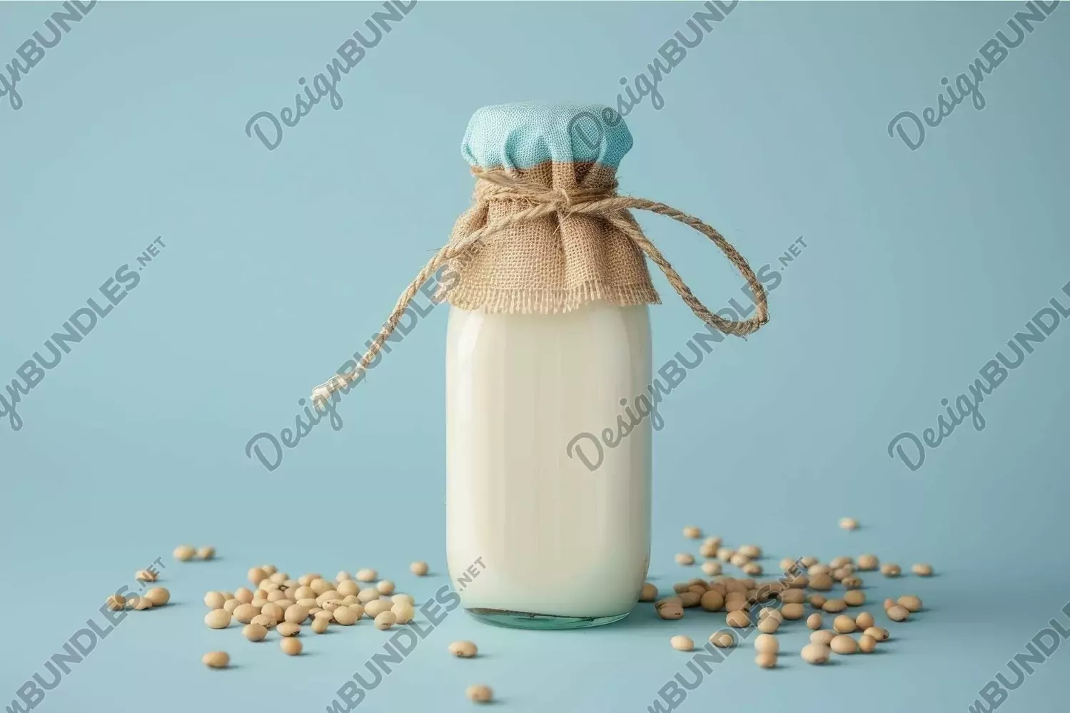 Bottle of soy milk with a cloth top and twine is standing on a blue background surrounded by soybeans