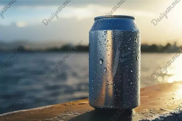 Cold can with condensation, reflecting the golden light of the setting sun, is standing on a surface with a blurred ocean view in the background