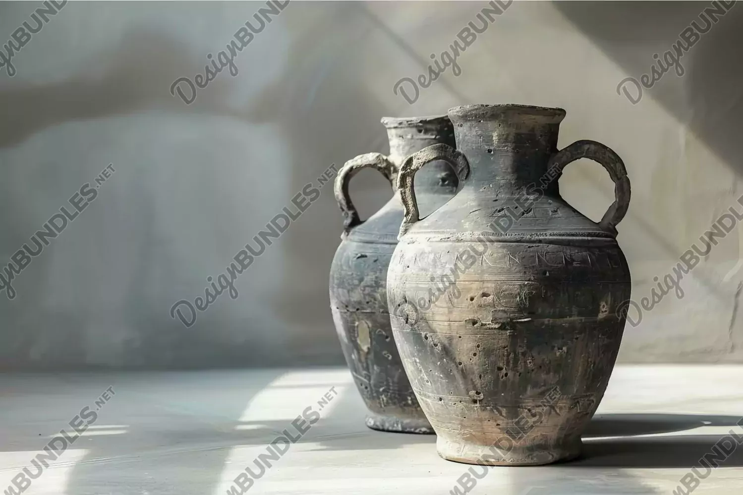 Similar Design Products to Two ancient greek amphorae standing on a white stone floor a