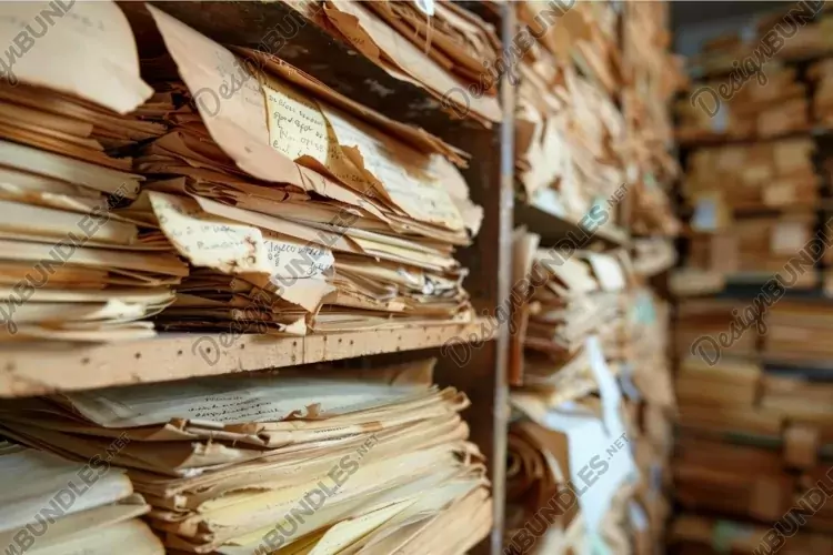 Stacks of old faded paper documents piling up in an archive example image 1